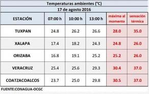 Debido a las lluvias nocturnas y los periodos de sol del mediodía, a las 13:00 horas de este miércoles la sensación térmica alcanzó los 37 grados Celsius en Veracruz y Coatzacoalcos; 35 grados en Tuxpan y 26 en Xalapa y Orizaba, de acuerdo al Organismo de Cuenca Golfo Centro de la CONAGUA.