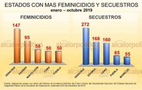 Si bien de septiembre a octubre los feminicidios y los secuestros descendieron en territorio veracruzano en más del 50 y 7 por ciento, respectivamente, Veracruz sigue siendo el primero del país en estos delitos de alto impacto, al sumar en los primeros 10 meses de este año 147 y 272 casos, respectivamente, de acuerdo a datos de la Secretaría de Gobernación.