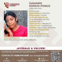 A través de la Comisión Estatal de Búsqueda del Estado de Veracruz, familiares de la adolescente Damaris Espejo Ponce, quien cumple años este miércoles, piden apoyo a la sociedad para dar con su paradero, ya que llevan 3 días sin saber de ella.