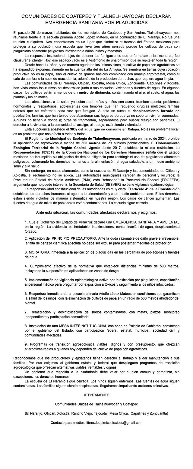 Entre las principales exigencias, solicitaron la declaratoria de emergencia sanitaria y ambiental en la región, la suspensión inmediata del uso de plaguicidas cerca de poblaciones y fuentes de agua, la reapertura de la escuela afectada con garantías de seguridad, así como la instalación de una mesa interinstitucional para dar seguimiento al problema.