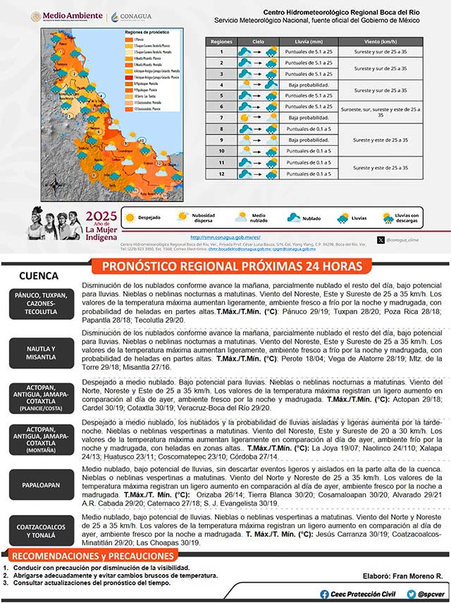Para esta jornada se prevén condiciones limitadas para lluvias; sin embargo, se pueden presentar eventos aislados y ligeros en regiones de montaña, así como nieblas o neblinas por la tarde-noche a primeras horas de la mañana. Los valores de la temperatura máxima registran un ligero ascenso en comparación con el día de ayer, persistiendo heladas al amanecer en partes altas. Viento del noreste, este y sureste con velocidades de 20 a 35 kilómetros por hora.