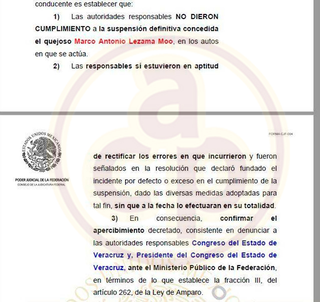 En su resolución, dictada dentro del Juicio de Amparo 1136/2019, el Juez Federal determinó procedente presentar la denuncia en contra de los legisladores ante la Fiscalía General de la República (FGR), luego de constatar que el 7 de junio de 2020, fecha en que el Congreso del Estado removió arbitrariamente del cargo de Magistrado a Marco Antonio Lezama Moo, éste contaba con una suspensión definitiva dictada dentro del Juicio de Amparo 1136/2019, para el efecto de que “las cosas se mantengan en el estado que actualmente guardan y, de no haber ocurrido ya, no se separe, cese o retire al quejoso Marco Antonio Lezama Moo del cargo de Magistrado del Estado de Veracruz o se ejecute un acto tendente al mismo”.