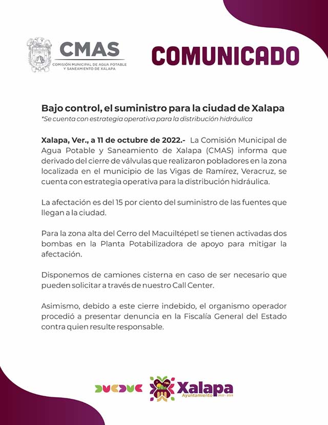 Tras el cierre de válvulas en el municipio de Las Vigas de Ramírez por parte de pobladores, la Comisión Municipal de Agua Potable y Saneamiento de Xalapa (CMAS) informó que se instrumentó una estrategia operativa para la distribución del vital líquido a los capitalinos.