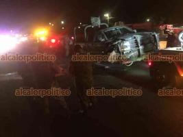 Por una presunta falla mecánica, una unidad rápida del Ejército Mexicano que venía en convoy, en el sentido de Cardel a Veracruz, colisionó contra un tractocamión, con remolque tipo plana, accidentándose sus ocupantes. Movilizándose personal castrense, Cruz Roja y oficiales de la Guardería Nacional.