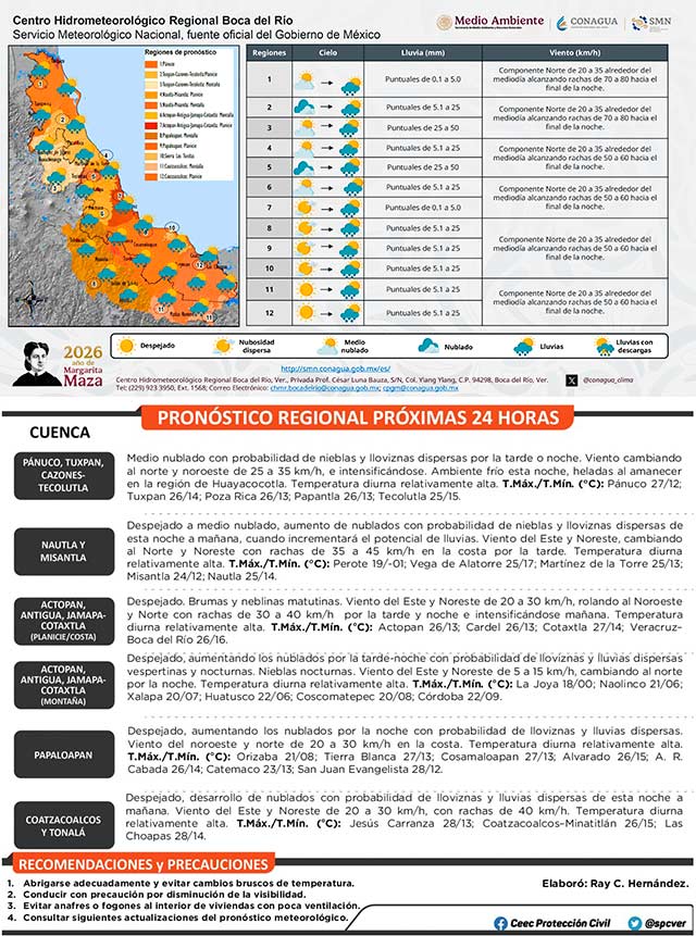 Jueves 5: Probabilidad de nieblas, lloviznas, lluvias y tormentas aisladas, con acumulados de 5 a 20 milímetros en promedio en el estado y máximos de 30 a 50 milímetros en la región de Los Tuxtlas, parte alta de la cuenca del Papaloapan y entre las cuencas del Coatzacoalcos y Tonalá. No se descarta la presencia de cencellada en las partes más altas del estado. Viento del Noroeste y norte de 50 a 65 kilómetros por hora con rachas de 75 a 90 kilómetros por hora en la costa centro, de 40 a 50 kilómetros por hora con rachas de 55 a 70 kilómetros por hora en las costas norte y sur, y de 40 a 55 kilómetros por hora en la parten alta entre Xalapa-Naolinco-Misantla y valle de Perote, disminuyendo gradualmente conforme avance la tarde y noche. Los valores de la temperatura máxima disminuyen y se mantiene ambiente fresco a frío por la noche y madrugada, con heladas en partes altas. Oleaje de 2.0 a 3.0 metros en las proximidades de la costa.