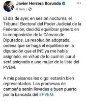 En sesión nocturna este sábado, el Tribunal Electoral del Poder Judicial de la Federación, decidió equilibrar género en la composición de la Cámara de Diputados, por lo que fue al PVEM a quien le correspondió ingresar una mujer a la diputación federal, informó Javier Herrera en sus redes sociales.