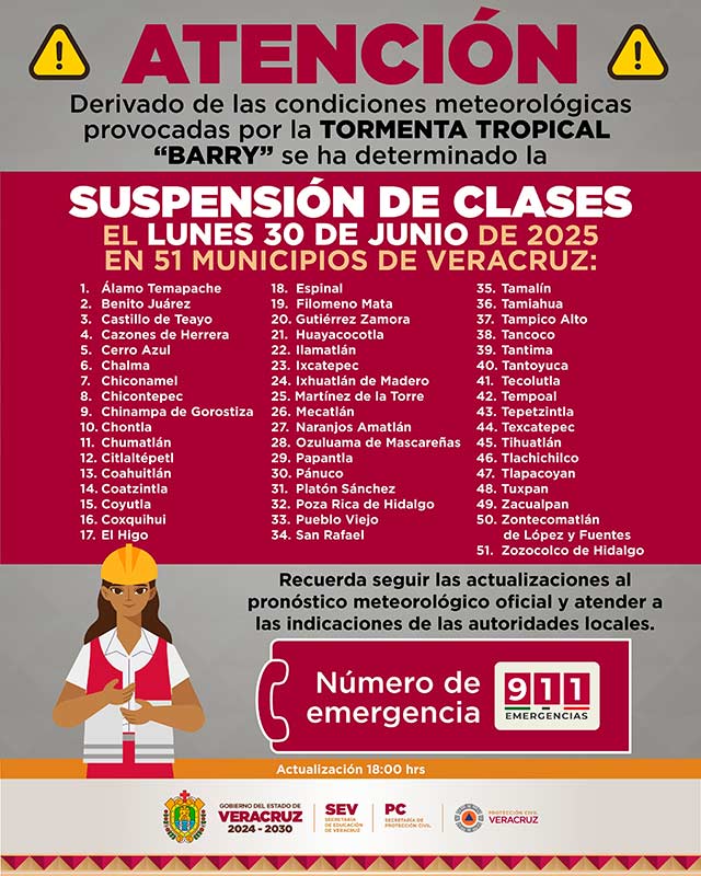Debido a los efectos de la tormenta tropical Barry, el Gobierno del Estado, a través de la Secretaría de Educación y la Secretaría de Protección Civil, determinó suspender las clases y actividades escolares de este lunes, en los turnos matutino y vespertino, en 51 municipios como medida preventiva.