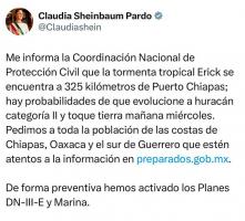 A través de redes sociales, la mandataria federal señaló que, según datos de la Coordinación Nacional de Protección Civil, el fenómeno representa un riesgo para las costas de Chiapas, Oaxaca y el sur de Guerrero, por lo que exhortó a la población a mantenerse informada mediante el sitio oficial preparados.gob.mx.