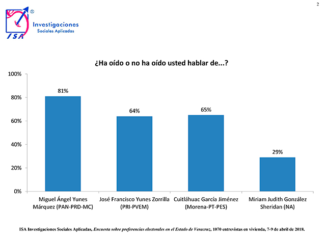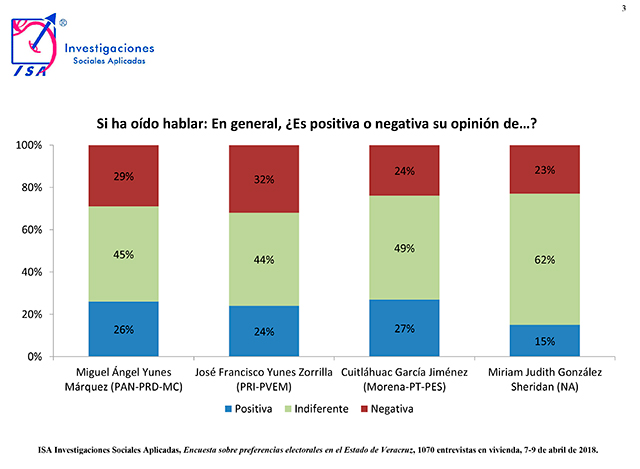 Es interesante el dato de que el 81% de los veracruzanos encuestados, dicen conocer a Miguel Ángel Yunes Márquez, del mismo nombre que su papá, el Gobernador; en tanto que a Cuitláhuac García y a Pepe Yunes los conocen entre el 64-65%, pero esa ventaja de Miguel Ángel no se refleja en la opinión positiva para él, pues en ese ítem de confianza están prácticamente empatados los tres punteros, entre el 24 y el 27 por ciento.