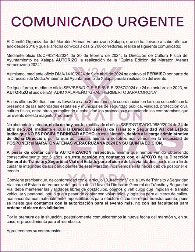 A través de un comunicado publicado en redes sociales, el comité organizador del Maratón Atenas Veracruz informó que la edición número 5 de esta justa que se lleva realizando desde 2018 se pospone debido a que Tránsito del Estado les informó mediante oficio que no podrá apoyar en esta ocasión con operativo para salvaguardar la seguridad de los participantes.