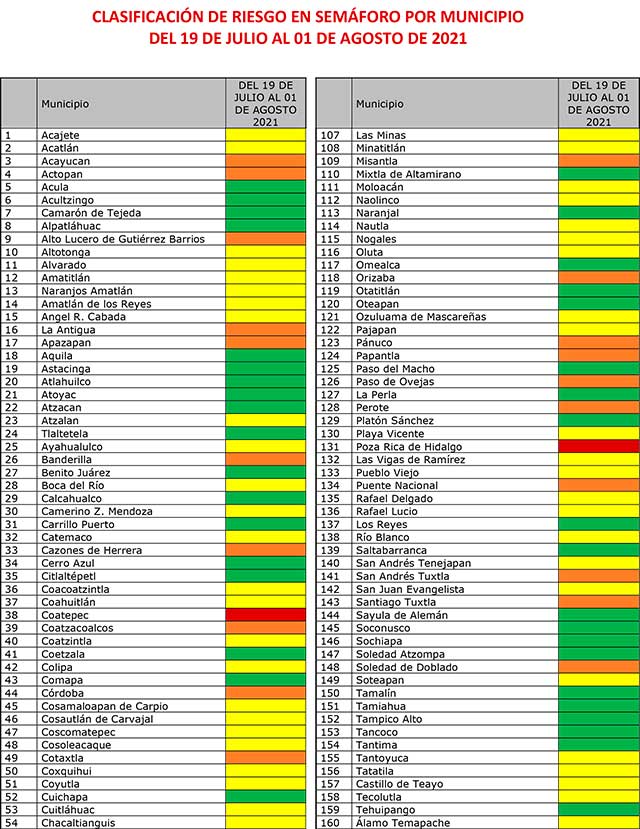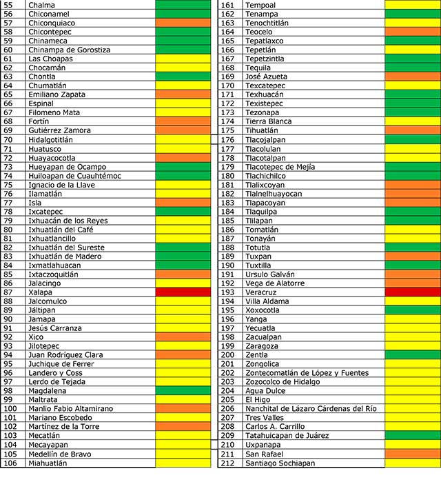 En la región Orizaba-Córdoba, dijo, la mayoría de los municipios se encuentran en verde; no obstante, las cabeceras como Córdoba y Orizaba ahora están en riesgo alto y Río Blanco continúa en amarillo.