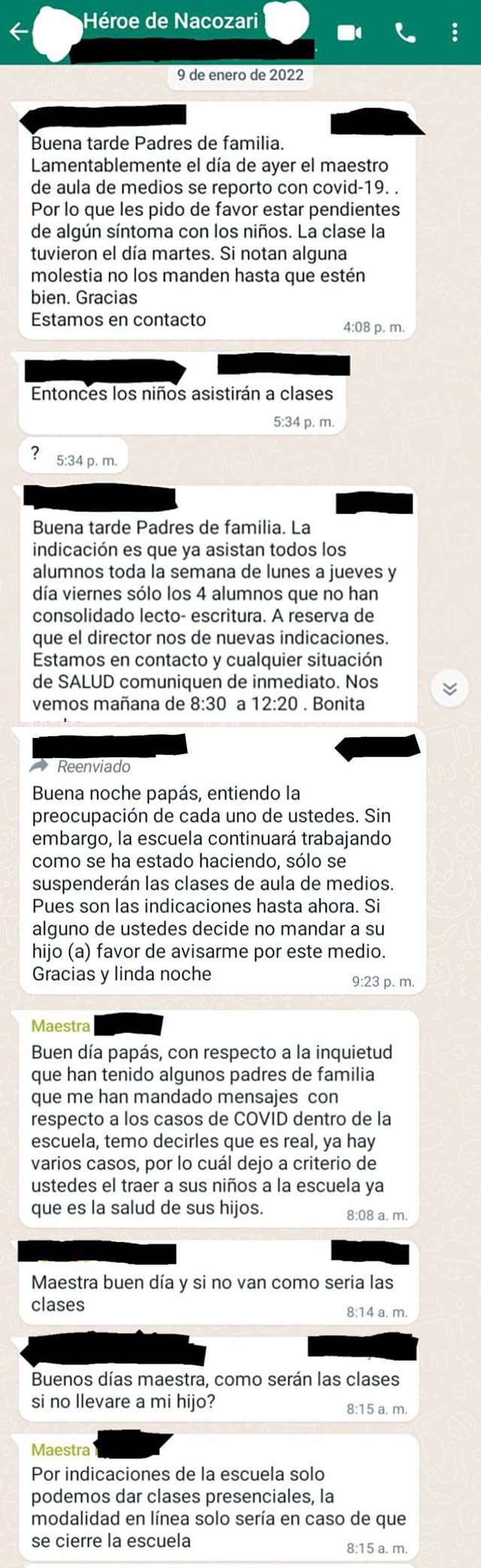 También hay un grupo que ya no va a clases porque otra profesora también está en aislamiento. Los niños que no van están perdiendo clases y los que van se arriesgan a contagiarse. Además, en la escuela no están aceptando las tareas que mandan las mamás porque los niños tienen que ir de forma presencial para que se las acepten.
