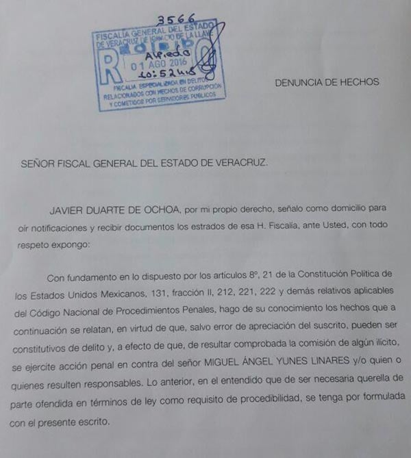 El gobernador del Estado, Javier Duarte de Ochoa, acudió a la Unidad de Atención Temprana de la Fiscalía General del Estado en compañía de funcionarios estatales, alcaldes, así como diputados locales y federales para presentar una denuncia en contra del gobernador electo, Miguel Ángel Yunes Linares, por supuesto enriquecimiento ilícito.