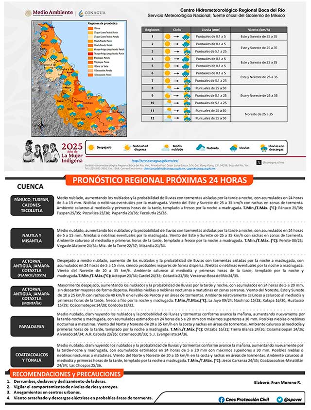 Para estas jornada se prevé cielo despejado a medio nublado con ambiente caluroso al mediodía y primeras horas de la tarde, aumentando los nublados por la tarde a noche con probabilidad de lluvias y tormentas aisladas especialmente en regiones de montaña del centro y en el sur del Estado. Viento del noreste, este y sureste de 20 a 35 kilómetros por hora con rachas en la costa, Valle de Perote y en posibles áreas de tormenta.