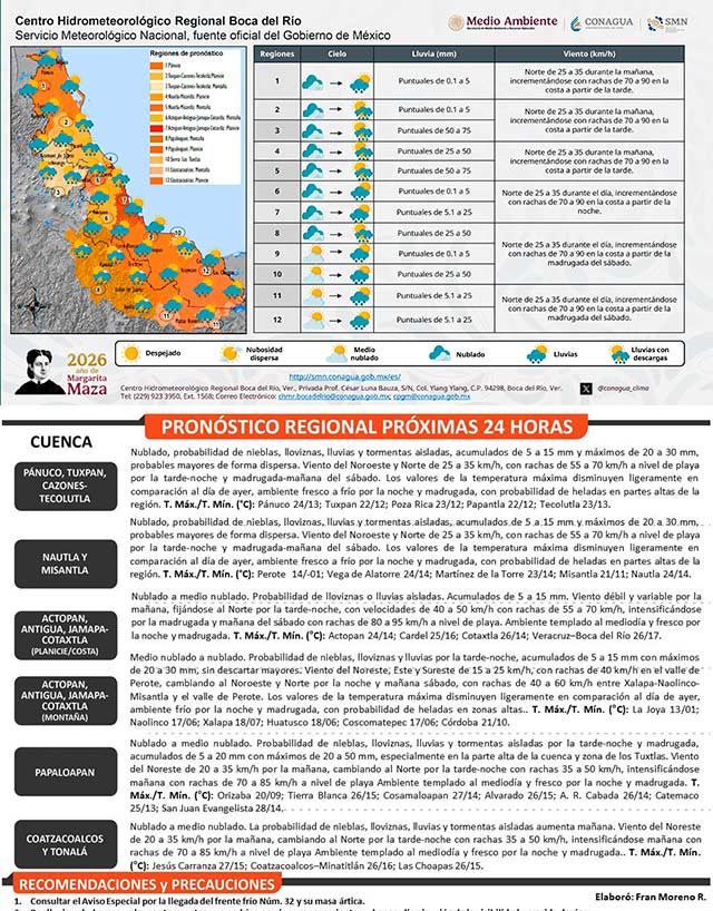 Viernes 30: Probabilidad de nieblas, lloviznas, lluvias y tormenta aisladas con acumulados de 5 a 20 milímetros en promedio en el Estado y máximos de 20 a 50 milímetros entre las cuencas del Tecolutla al Colipa, Altas Montañas, parte alta del Papaloapan y región de Los Tuxtlas. Viento del noroeste y norte de 40 a 50 kilómetros por hora con rachas de 55 a 70 kilómetros por hora, principalmente en la costa norte y centro, y de 40 a 50 kilómetros por hora en la costa sur. Ambiente templado a fresco al mediodía y fresco a frío por la noche a madrugada, con probabilidad de heladas en partes altas. Oleaje de 1.0 a 2.0 metros en las proximidades de la costa.