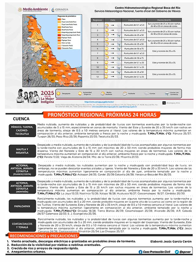 El viento dominará del sureste, este y noreste con velocidades de 20 a 35 kilómetros por hora, y rachas superiores en zonas de tormenta. Se prevé oleaje de 0.5 a 1.0 metros cercano al litoral. Aumento gradual de las temperaturas; ambiente diurno caluroso y bochornoso en planicies y costas, mientras que en áreas montañosas se espera de templado a cálido.