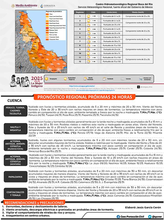 Se localiza una vaguada sobre el suroeste del Golfo de México y se prevé el paso de la onda tropical número 16 sobre el sur de la República Mexicana; esto, aunado al apoyo de divergencia en altura, son condiciones que mantendrán en el estado de Veracruz cielo nublado con potencial para lluvias, chubascos y tormentas aisladas con acumulados de 5 a 20 milímetros y máximos de 20 a 50 milímetros, estos últimos especialmente en cuencas del centro y sur del estado. La temperatura máxima con poco cambio en comparación al día de ayer; ambiente templado a fresco por la noche a madrugada. Viento dominante del sureste, este y noreste de 20 a 35 kilómetros por hora, con rachas de 45 kilómetros por hora en el valle de Perote y la costa sur, mayores en áreas de tormenta. Consulte el Aviso Especial por temporal lluvioso.