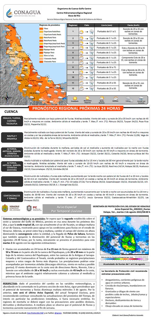Por su parte, el pronóstico indica que el campo de vientos en la atmósfera alta se modifique lentamente a partir de mañana para dar como resultado gradual disminución en el potencial de lluvias, siendo probables eventos de menor intensidad y cantidad en comparación con días anteriores. No obstante, se recomienda mantenerse al pendiente de siguientes actualizaciones y seguir extremando precauciones principalmente en montañas por la posibilidad de derrumbes, deslaves y deslizamientos de laderas.