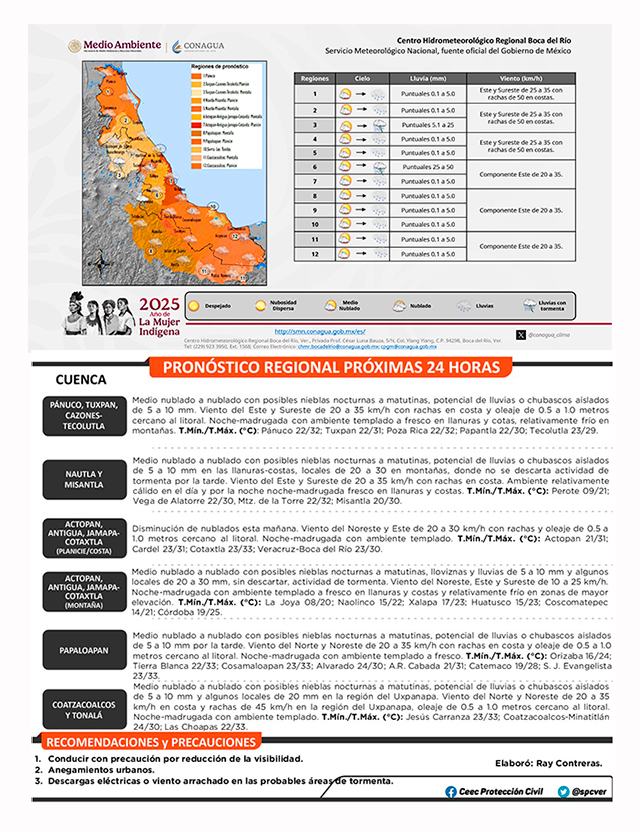 Una vaguada en superficie se localiza sobre el oeste y suroeste del Golfo de México, situación que mantiene el ingreso de humedad hacia el estado de Veracruz, donde los efectos de la orografía y la divergencia del viento en altura ocasionan tiempo medio nublado a nublado con potencial para nieblas matutinas, lloviznas y lluvias con acumulados generales de 5 a 10 milímetros en las llanuras-costas y locales de 20 a 30 milímetros sobre regiones montañosas, donde no se descarta la probabilidad de actividad eléctrica por la tarde.