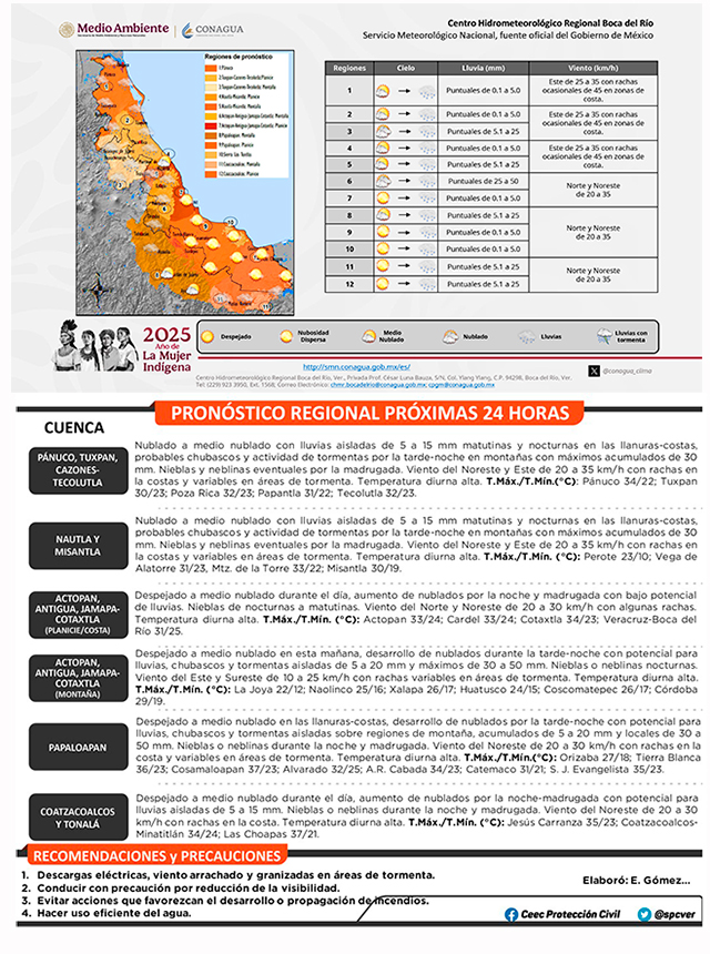 Gran parte de esta semana dominará ambiente diurno cálido, viento del este y noreste moderado en costas y probables lluvias, chubascos y tormentas aisladas (viento arrachado, descargas eléctricas y granizadas) por las tardes en montañas. Tome precauciones.