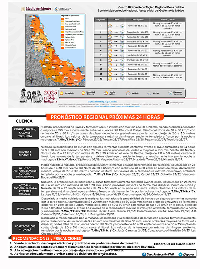 El frente frío número 42 se localiza sobre el sur de Tamaulipas. Por delante de él una línea de cortante ha anticipado la dirección del viento a norte sobre Veracruz; además, una línea de turbonada sobre el norte de dicha entidad. Estos sistemas, en conjunto, han incrementado los nublados, lluvias y tormentas en el norte del Estado, las cuales tenderán a generalizarse conforme avance el día. Se esperan acumulados generales de 5 a 30 milímetros, con máximos puntuales de 50 a 70 milímetros, siendo posibles registros del orden de 150 milímetros o más, de forma dispersa, especialmente entre la cuenca baja del Pánuco hasta la del Colipa.