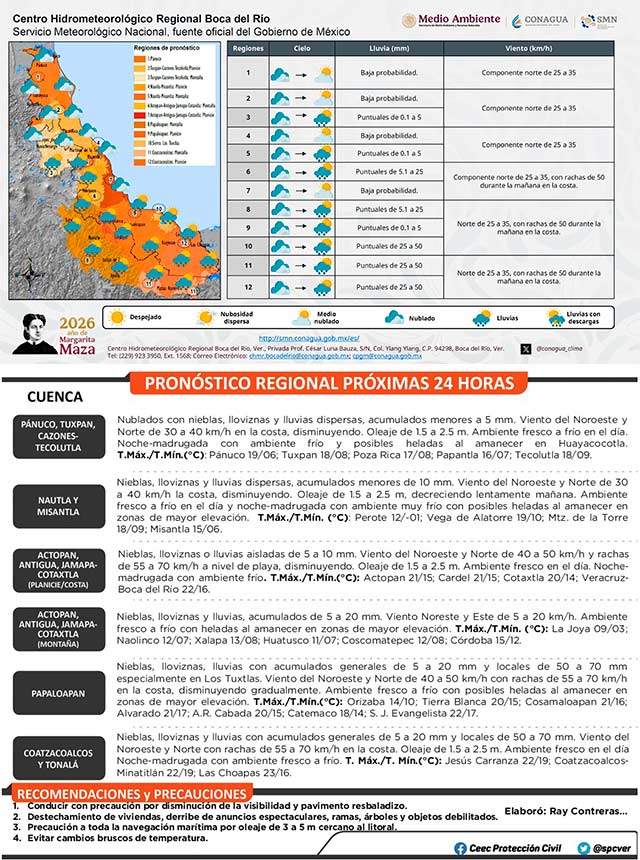 El pronóstico indica que durante este martes la entidad tendrá la presencia de nieblas, lloviznas y lluvias moderadas especialmente en la zona sur. El viento del norte tenderá a debilitarse; sin embargo, aún presentará rachas frescas a fuertes en costas y oleaje elevado cercano al litoral. Finalmente, el ambiente continuará frío, especialmente en zonas serranas con heladas al amanecer en zonas de mayor elevación. Se desactiva la alerta gris del SIAT-VER, pero se emite un aviso especial por efectos menores de estos sistemas.