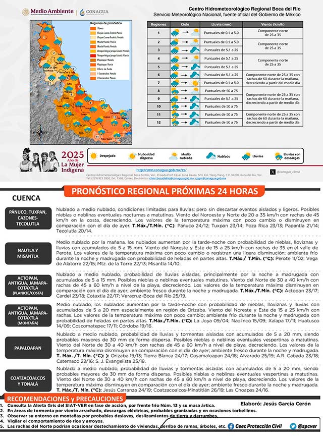 Martes con probabilidad de lluvias en zonas de montaña del centro y cuencas del Papaloapan al Tonalá. Evento de “norte” con rachas frescas a fuertes en zonas costeras y oleaje de 1.0 a 3.0 metros cercano al litoral. Ambiente diurno templado a fresco.