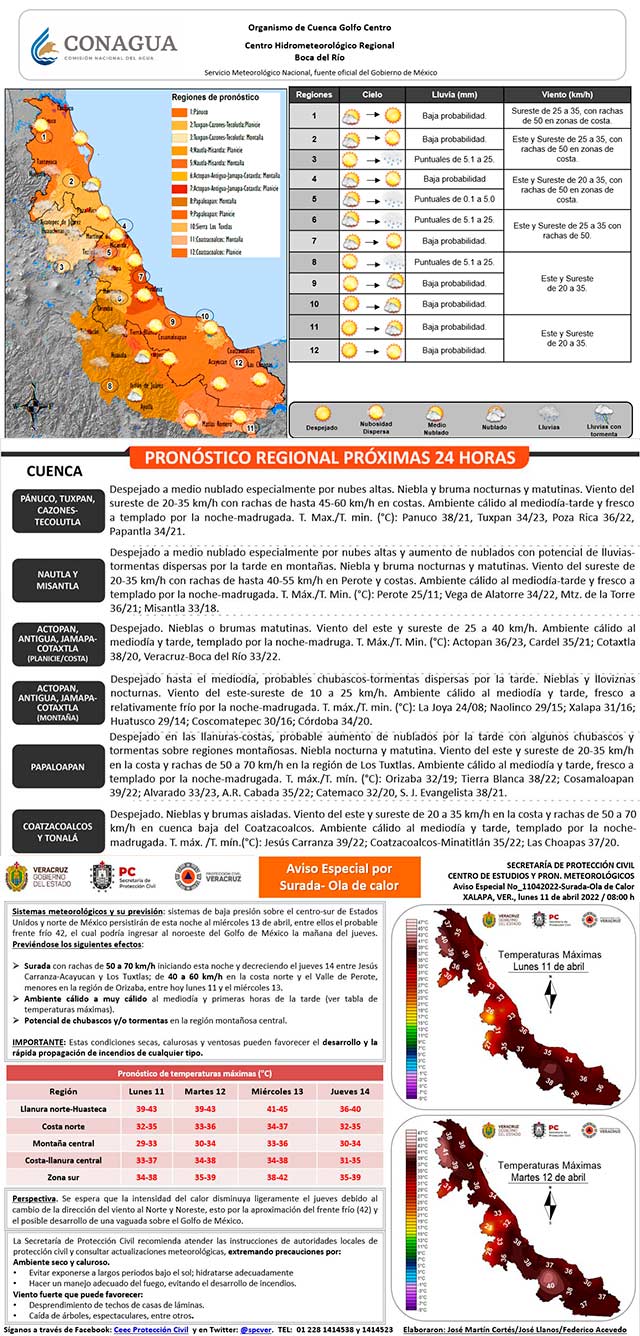 La amplia circulación anticiclónica sobre el Golfo de México y su interacción con varios sistema de baja presión sobre la región central de los Estados Unidos de América favorecerán el gradual desarrollo de un evento de surada en la costa norte, Perote-Orizaba y cuenca baja del Coatzacoalcos para apoyar un ola de calor en territorio veracruzano entre hoy lunes y el próximo jueves. Durante este periodo, el potencial de lluvias limitado en zonas de llanura-costa y bajo sobre regiones de montaña donde en horas de la tarde o noche se pueden presentar lluvias, chubascos y tormentas dispersas.