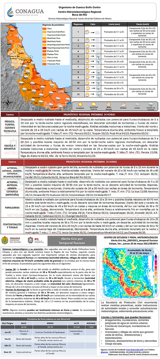 Una vaguada se localiza desde Luisiana, Estados Unidos, hasta el suroeste del Golfo de México y de donde se aloja una línea de turbonadas sobre la región central del mismo Golfo, previendo que dicha vaguada persista al menos en las siguientes 24 a 48 horas frente a las costas de Veracruz, situación apoyada por una vaguada de niveles superiores de la atmósfera mantendrán durante este periodo condiciones para lluvias en territorio veracruzano, las de mayor importancia y asociadas con actividad de tormentas dispersas (viento arrachado, descargas eléctricas y granizadas) sobre regiones montañosas y en algunas áreas de la zona sur, menores en el resto de la entidad.