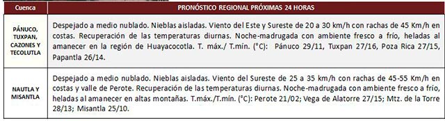 Una dorsal domina sobre el Golfo de México, mientras que una baja presión se fortalece sobre el sur de EUA y norte de México, tal situación favorecerá un evento de “surada” con probables rachas de 50 a 60 km/h en la costa norte y de menor intensidad en Perote y parte alta de Orizaba, además apoyará tiempo estable con cielo mayormente despejado y ambiente diurno de templado a cálido. Sin embargo, las noches-madrugadas serán frías con probables heladas al amanecer en altas montañas. Estas condiciones de tiempo se extenderán al viernes.