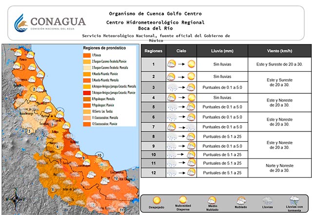 El sábado se prevé que un Frente Frío (número 30) recorra rápidamente el Estado de Veracruz. Generaría un evento de “norte” fuerte a violento en la costa, incremento del oleaje, además de los nublados con nieblas, lloviznas y lluvias dispersas así como descenso de temperatura.