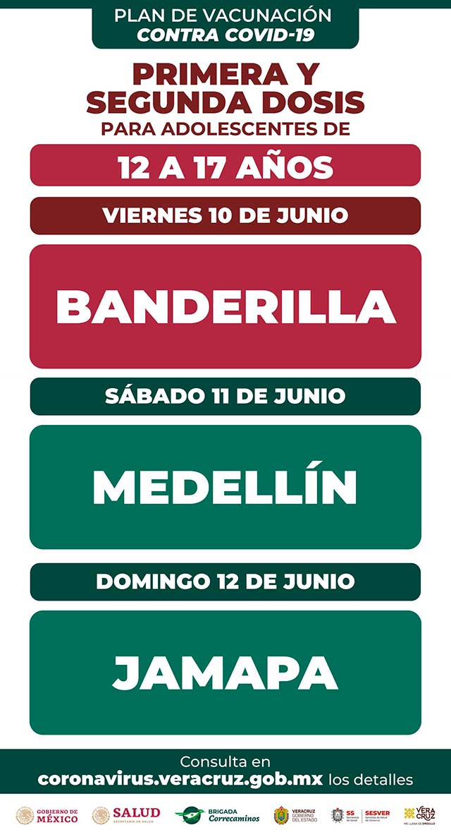 Xalapa, Ver., 9 de junio de 2022.- El Gobierno del Estado informó que la vacunación antiCOVID para los de 12 a 17 años, en primera y segunda dosis, será en Banderilla, Medellín de Bravo y Jamapa, este viernes, sábado y domingo.