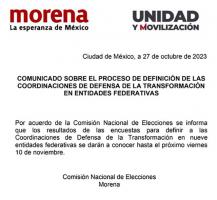 El dirigente nacional del partido Movimiento Regeneración Nacional (MORENA), Mario Delgado, informó que por acuerdo de la Comisión Nacional de Elecciones los resultados de las encuestas para definir a las Coordinaciones de los Comités de Defensa de la Cuarta Transformación en 9 entidades federativas se darán a conocer hasta el viernes 10 de noviembre.