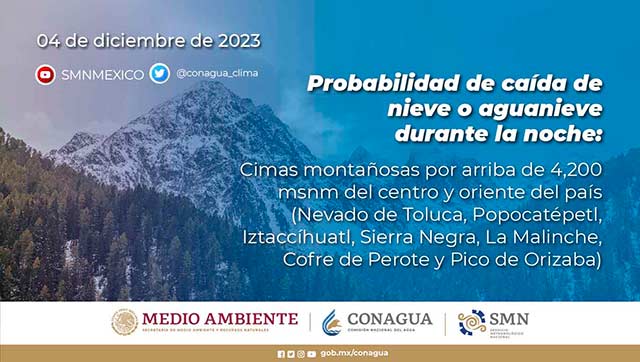 “Durante esta noche, se prevé la caída de nieve o aguanieve en cimas montañosas por arriba de los 4 mil 200 msnm del centro y oriente del País”.