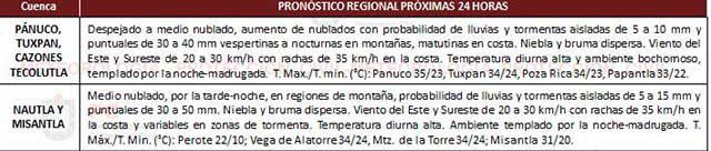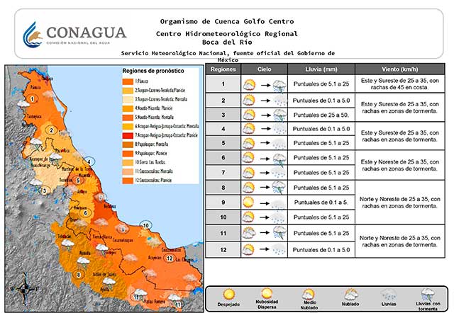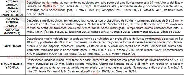 Un sistema de alta presión se localiza en el noreste del Golfo de México mientras en el suroeste una vaguada asociada a tormentas frente a costas del norte de Veracruz, tenderían a disminuir, mientras en el centro y sur se observa cielo despejado a medio nublado, la probabilidad de lluvias disminuye pero pueden ocurrir eventos dispersos por la tarde y noche en regiones de montaña. Se estiman de 5 a 15 milímetros y puntuales de 30 a 50 milímetros, la probabilidad de lluvias se extendería a regiones de llanura y costa por la noche y madrugada. Las temperaturas serán altas y el ambiente bochornoso en zonas de llanura y litoral. El viento será variable del Noreste, Este y Sureste con rachas de 35 kilómetros por hora.