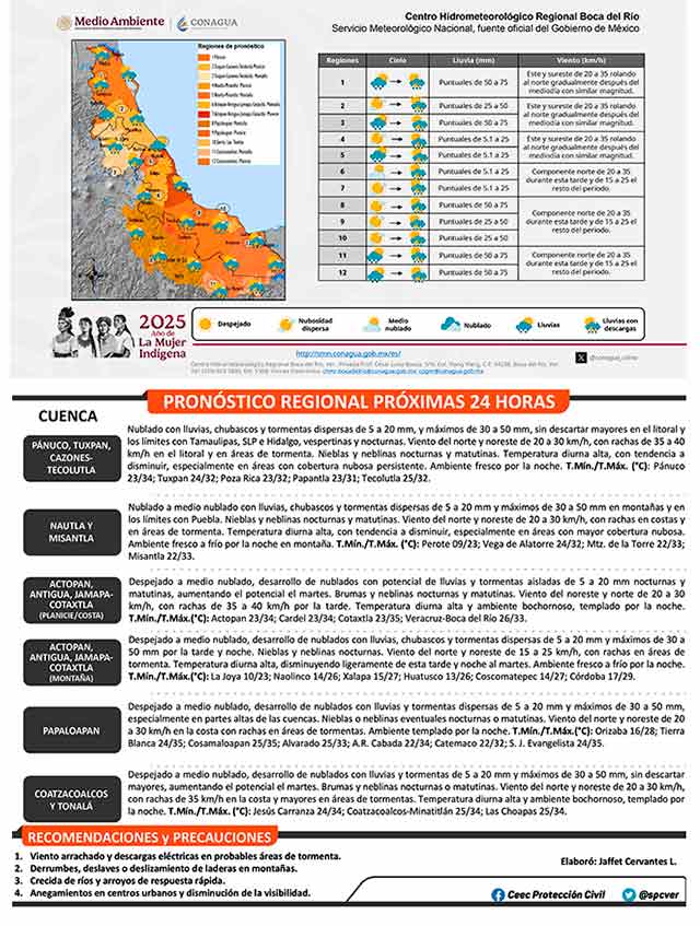 Se localiza el sistema frontal número, 2 estacionado en el noreste y norte del Golfo de México junto con una vaguada en el suroeste y la onda tropical número 31, cuyo eje se ubica al sur de la Península de Yucatán. Esta situación favorece un lunes con desarrollo de nublados y probabilidad de lluvias y tormentas dispersas en Veracruz, iniciando en cuencas del norte y extendiéndose al centro y sur. Se estiman acumulados de 5 a 20 milímetros y máximos de 30 a 50 milímetros en las cuencas del Pánuco al Tuxpan y Papaloapan al Tonalá.