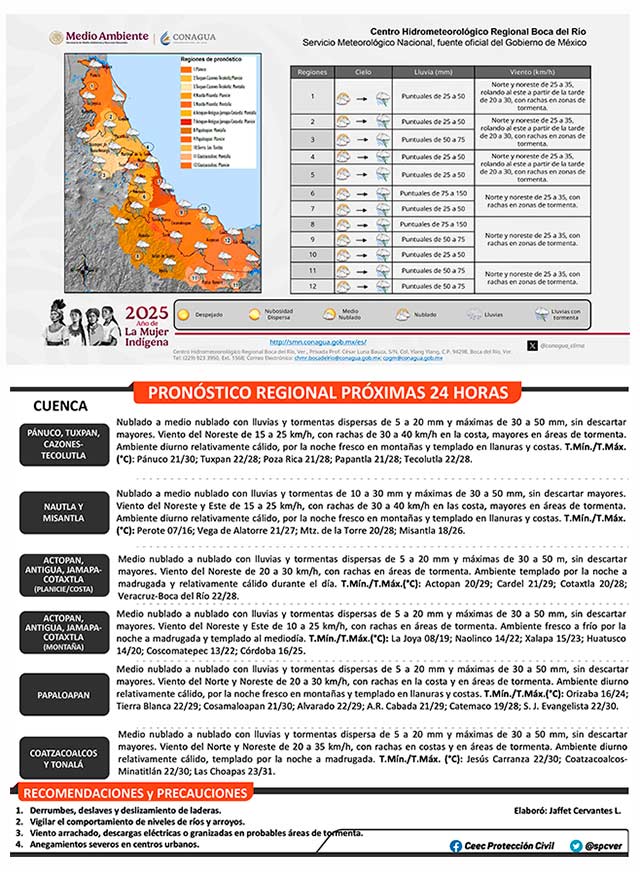 Mientras tanto, en Veracruz domina un miércoles medio nublado a nublado, con lluvias y tormentas dispersas matutinas en el litoral y llanura, vespertinas y nocturnas en montaña, con acumulados en 24 horas, de 5 a 20 milímetros y máximos de 30 a 50 milímetros, sin descartar mayores. Viento del noreste y este de 20 a 30 kilómetros por hora, con rachas en áreas de tormentas. Oleaje de 0.5 a 1.2 metros. Ambiente diurno relativamente cálido, fresco a relativamente frío por la noche a madrugada.