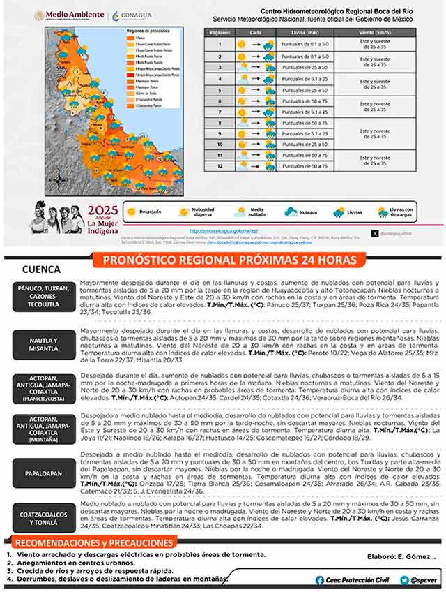Se recomienda extremar precauciones por viento arrachado, descargas eléctricas y granizadas en áreas de tormenta, anegamientos en centro urbanos, crecida de ríos y arroyos de respuesta rápida, así como, por derrumbes, deslaves y deslizamiento de laderas sobre regiones montañosas.