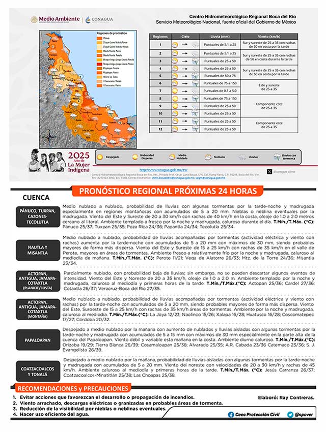 Una vaguada sobre el Altiplano mexicano y otra en el suroeste del Golfo de México mantienen la afluencia de aire marítimo tropical hacia el estado de Veracruz, donde en combinación con el calentamiento diurno y la orografía pueden ocasionar la presencia de lluvias con tormenta por la tarde-noche con máximos de 30 a 50 milímetros (sin descartar mayores) en montañas del norte y centro, nocturnas de 5 a 15 milímetros en el resto del estado.