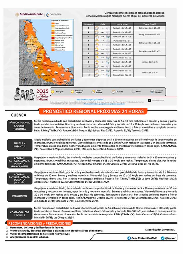 Se localiza una vaguada en el suroeste del Golfo de México y la onda tropical número 13 en el oeste de la Península de Yucatán, que se prevé cruce nuestra región en las próximas 24 horas. En Veracruz, se espera un viernes despejado a medio nublado, con potencial de lluvias y tormentas de 5 a 20 milímetros, y máximos de 30 milímetros, especialmente en cuencas el sur y centro. Las lluvias ocurrirán matutinas y nocturnas en el litoral, y por la tarde y noche en montaña. Las temperaturas diurnas serán altas con un ambiente bochornoso. El viento dominará del norte y noreste moderado, con rachas en áreas de tormenta. De domingo al lunes, se pronostica el paso de otra onda tropical, actualmente en el centro del Caribe. Consulte la actualización del pronóstico.