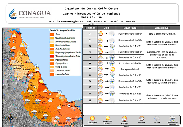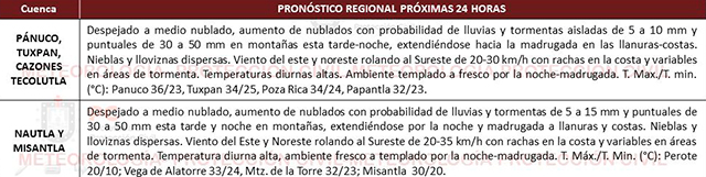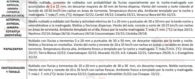 Las temperaturas serán altas y el ambiente diurno cálido y bochornoso en llanura y costa, mientras que en montañas será templado. El viento dominará de Este-Sureste con rachas de 30-35 kilómetros por hora rolando al Noreste de forma parcial. Las condiciones para el desarrollo de nublados con probabilidad de lluvia persistirá a inicios de semana. Extreme precauciones ante inundaciones, encharcamientos, crecida de ríos y arroyos de respuesta rápida, así como por deslaves/derrumbes en montañas.
