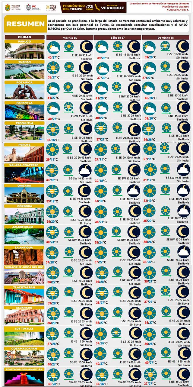 A lo largo de Veracruz continuará ambiente muy caluroso y bochornoso con bajo potencial de lluvias. Se recomienda consultar actualizaciones y el Aviso Especial por ola de calor. Extreme precauciones ante las altas temperaturas