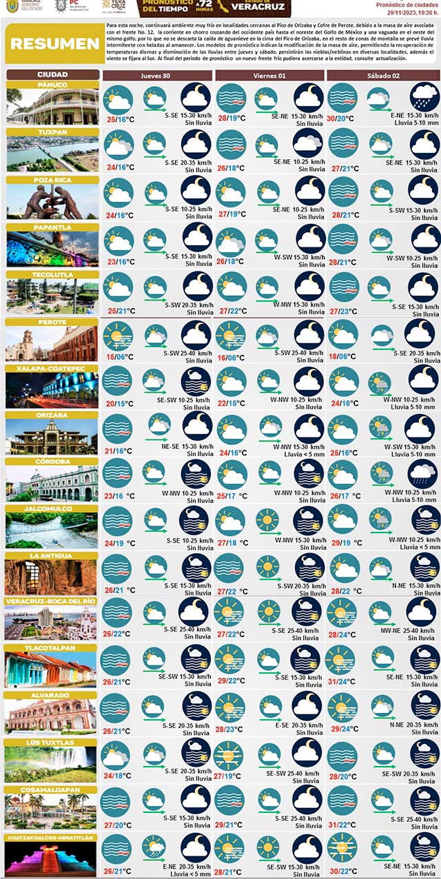 Ambiente muy frío en localidades cercanas al Pico de Orizaba y Cofre de Perote, por lo que no se descarta la caída de aguanieve en la cima del Pico de Orizaba en la madrugada; en el resto de zonas de montaña se prevé lluvia intermitente con heladas al amanecer. Recuperación de temperaturas diurnas y menos lluvias entre jueves y sábado.