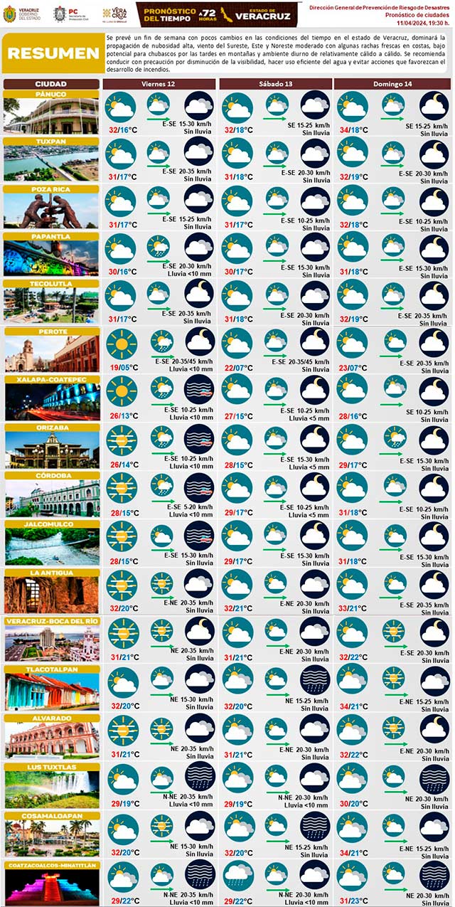 Se prevé fin de semana con pocos cambios en las condiciones del tiempo en Veracruz. Dominará nubosidad alta, viento del sureste, este y noreste moderado con algunas rachas frescas en costas, bajo potencial para chubascos por las tardes en montañas y ambiente diurno de relativamente cálido a cálido