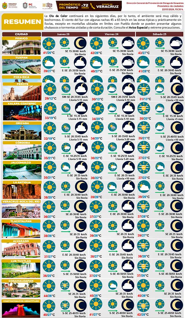 La ola de calor continuará en los siguientes días, por lo que el ambiente será muy cálido y bochornoso. Viento del sur con algunas rachas de 45 a 65 kilómetros por hora en las zonas típicas; prácticamente sin lluvias, excepto en montañas limítrofes con Puebla, donde podría haber chubascos o tormentas aisladas y breves. Consulte el Aviso Especial