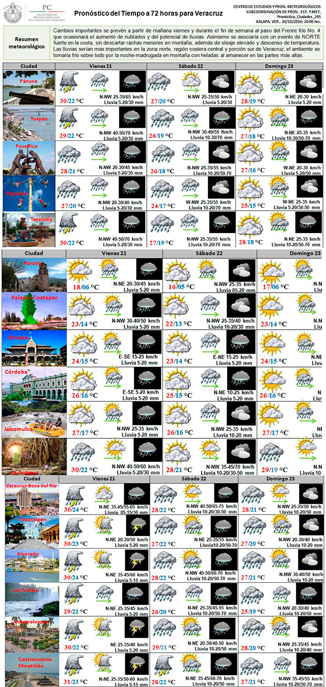 Aumentarán nublados y lluvias por el frente frío número 4. Se espera norte fuerte en costa, con descenso de temperatura y oleaje elevado, así como rachas menores en montaña, donde se prevén heladas al amanecer.