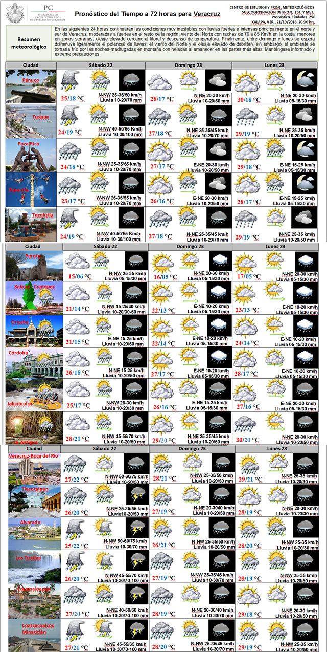 Continuarán durante el sábado las lluvias y el “norte”, intensos en el norte y sur y moderados a fuertes en el resto del Estado. Disminuirán entre domingo y lunes, pero permanecerá el ambiente frío en montaña, con heladas matutinas en las partes más altas.