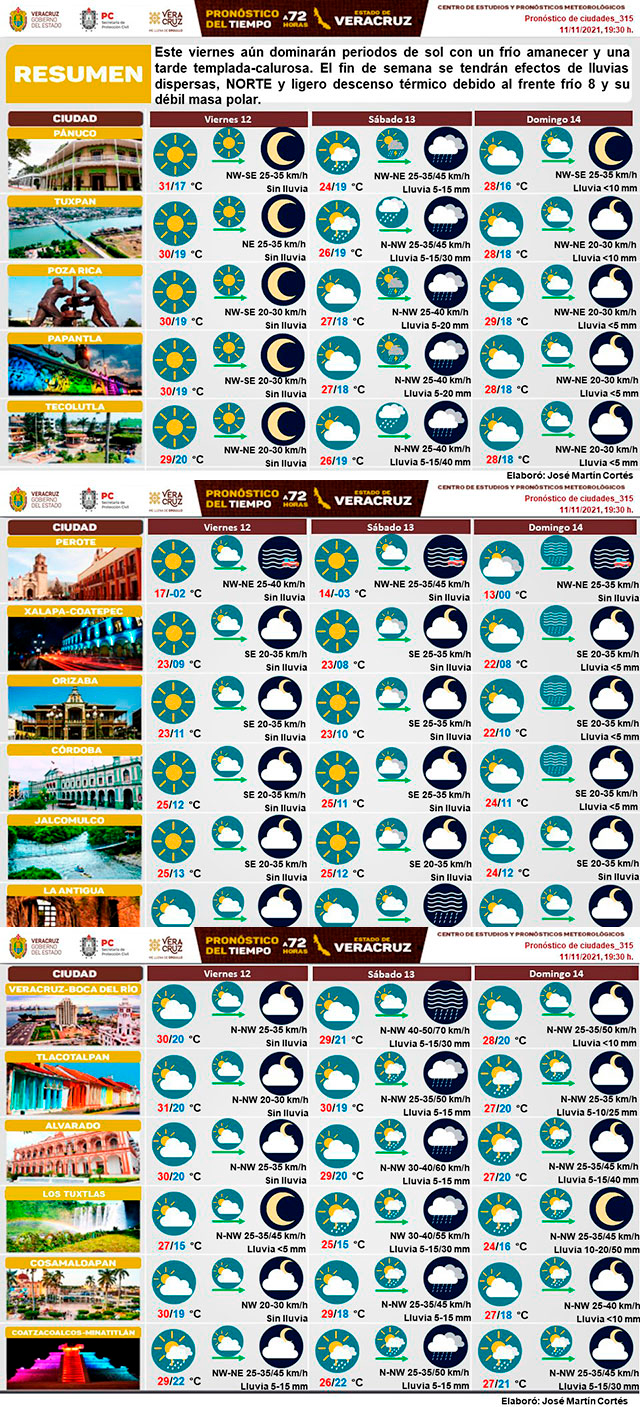 Este viernes aún dominarán periodos de sol con un frío amanecer y una tarde templada-calurosa. El fin de semana se tendrán efectos de lluvias dispersas, Norte y ligero descenso térmico debido al Frente Frío 8 y su débil masa polar.