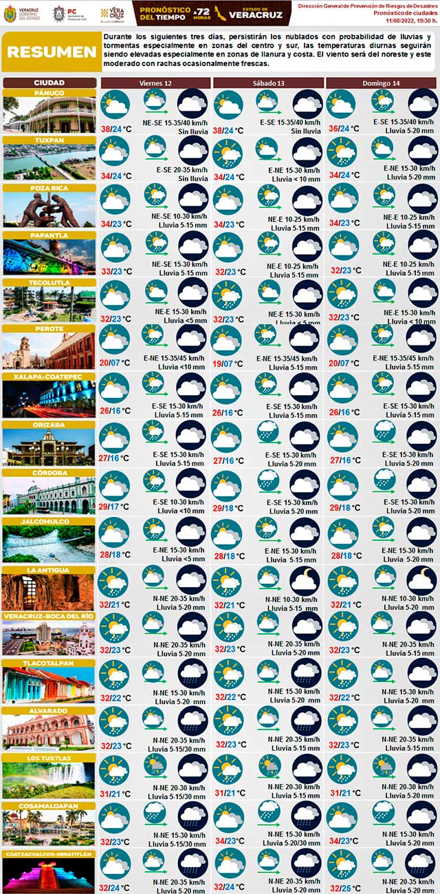 Durante los siguientes tres días persistirán los nublados con probabilidad de lluvias y tormentas, especialmente en zonas del centro y sur; las temperaturas diurnas seguirán siendo elevadas especialmente en zonas de llanura y costa. El viento será del Noreste y Este, moderado con rachas ocasionalmente frescas.