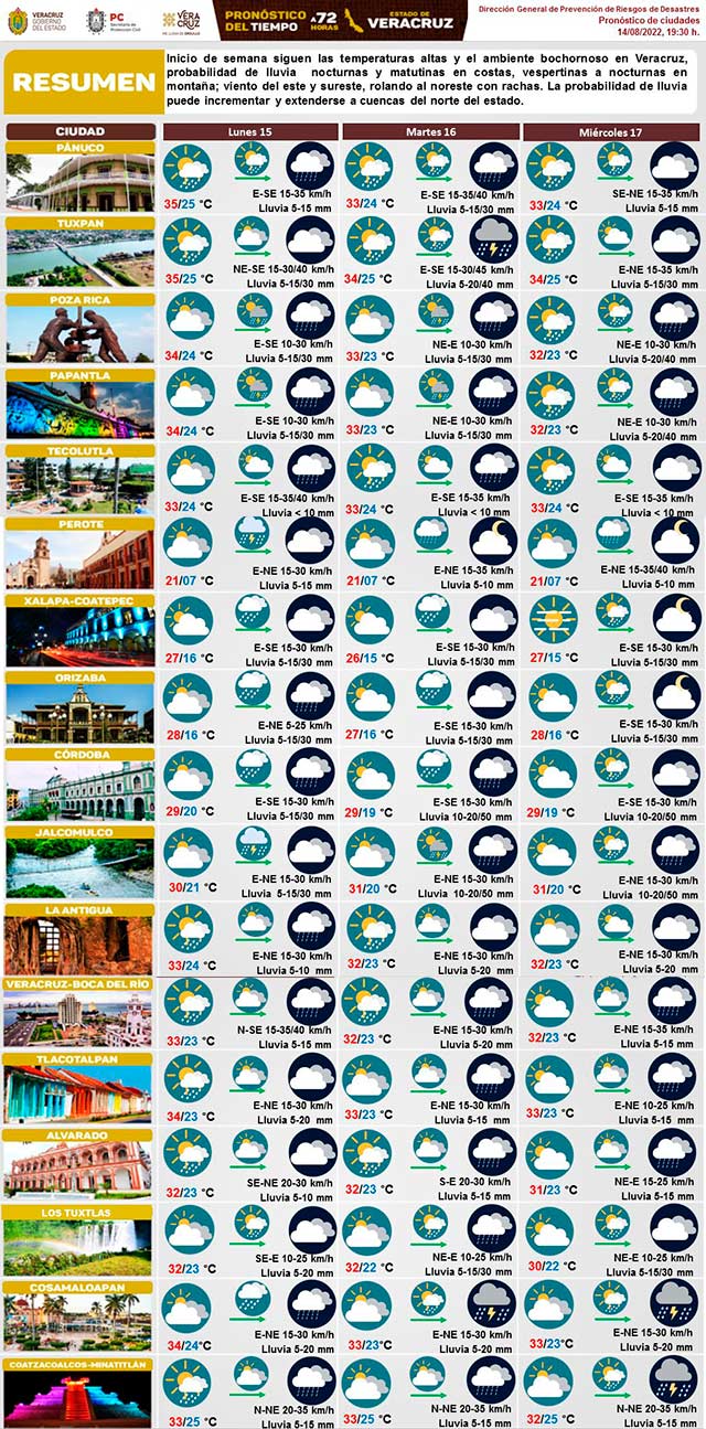 Al inicio de semana siguen las temperaturas altas y el ambiente bochornoso en Veracruz, probabilidad de lluvia nocturna y matutina en costas, vespertina a nocturnas en montañas; viento del Este y Sureste, rolando al Noreste con rachas. La probabilidad de lluvia puede incrementar y extenderse a cuencas del Norte del Estado.